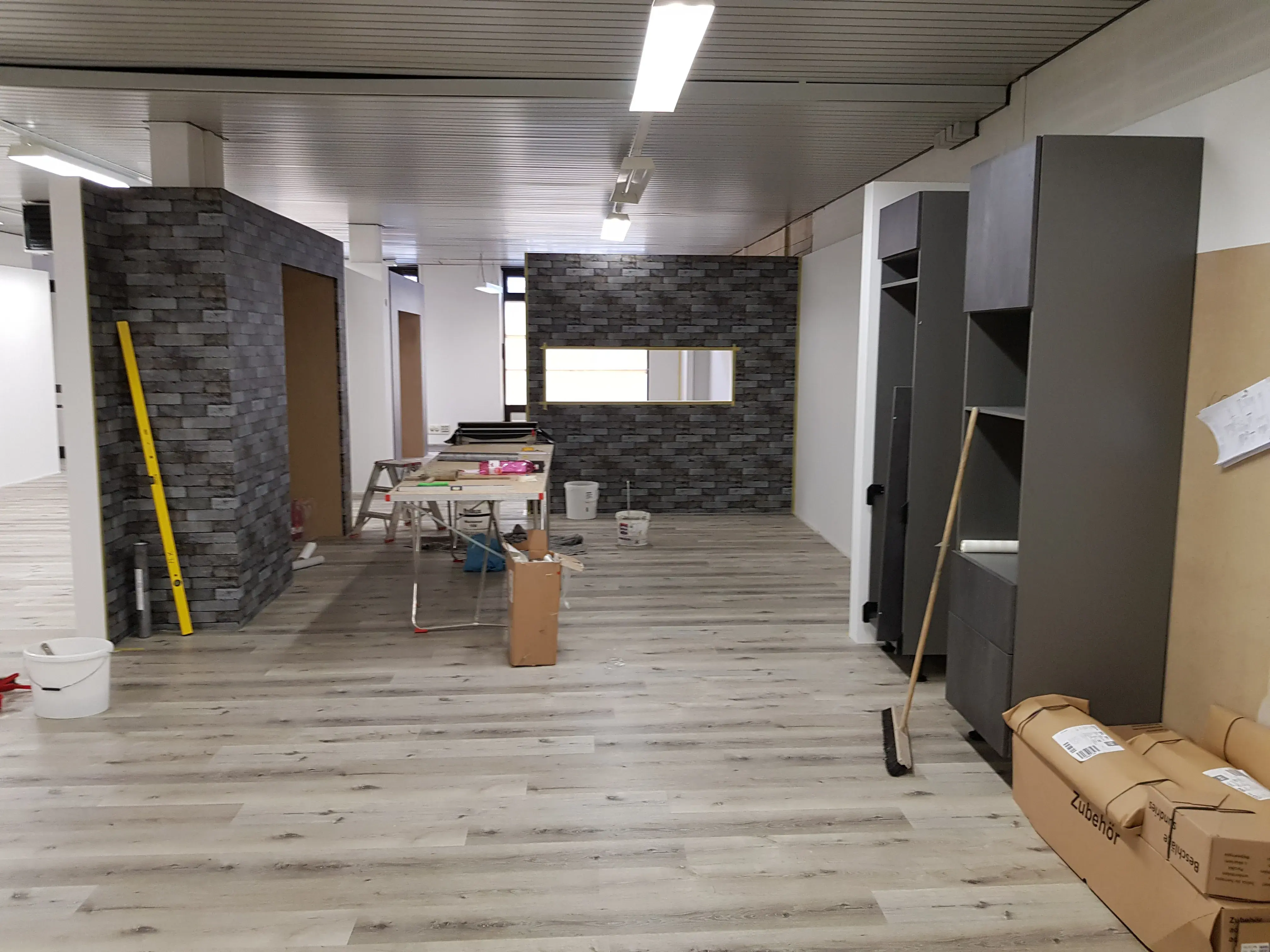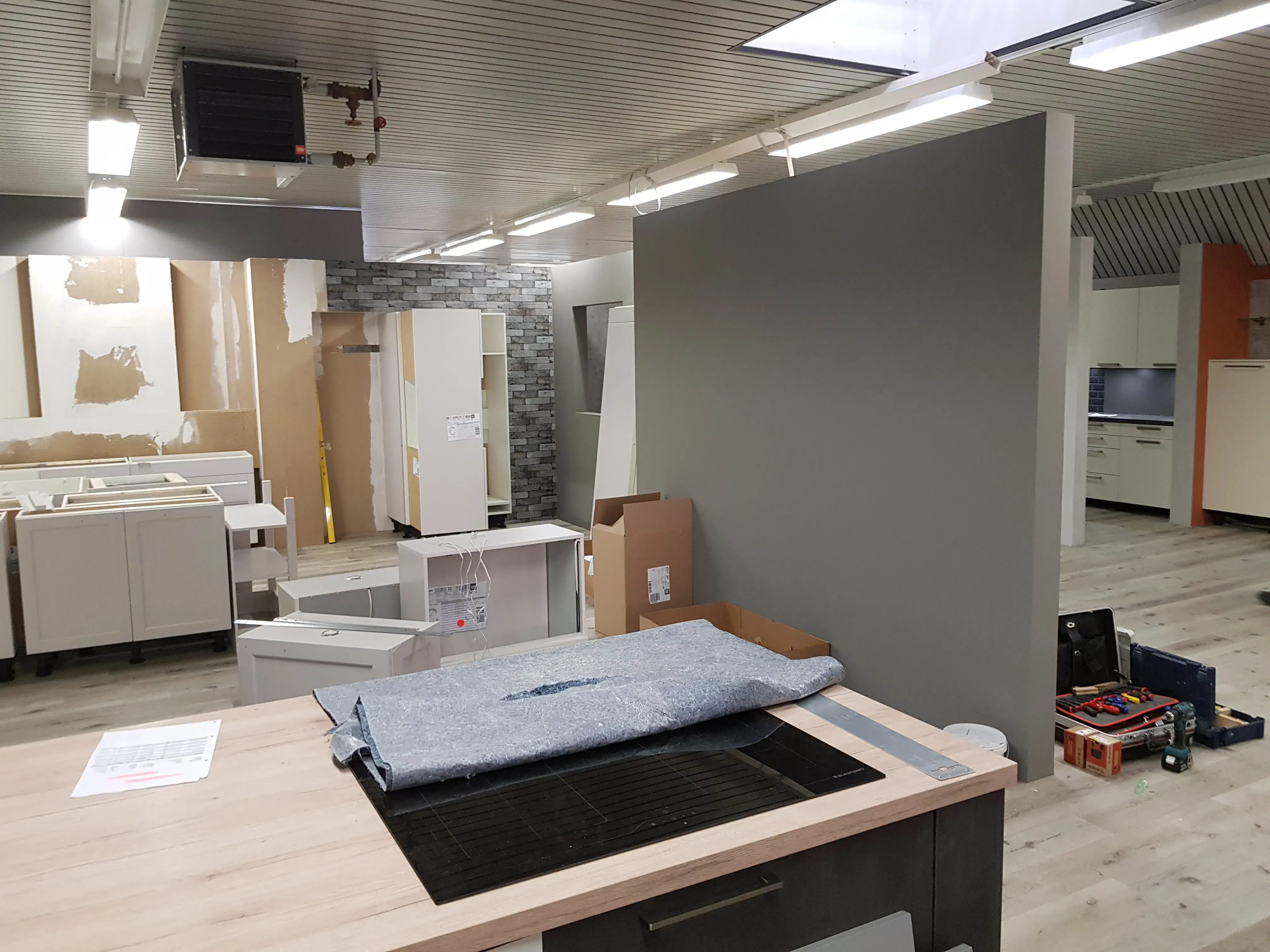 Gestaltung der Wände und Beginn des Musterküchen-Aufbaus