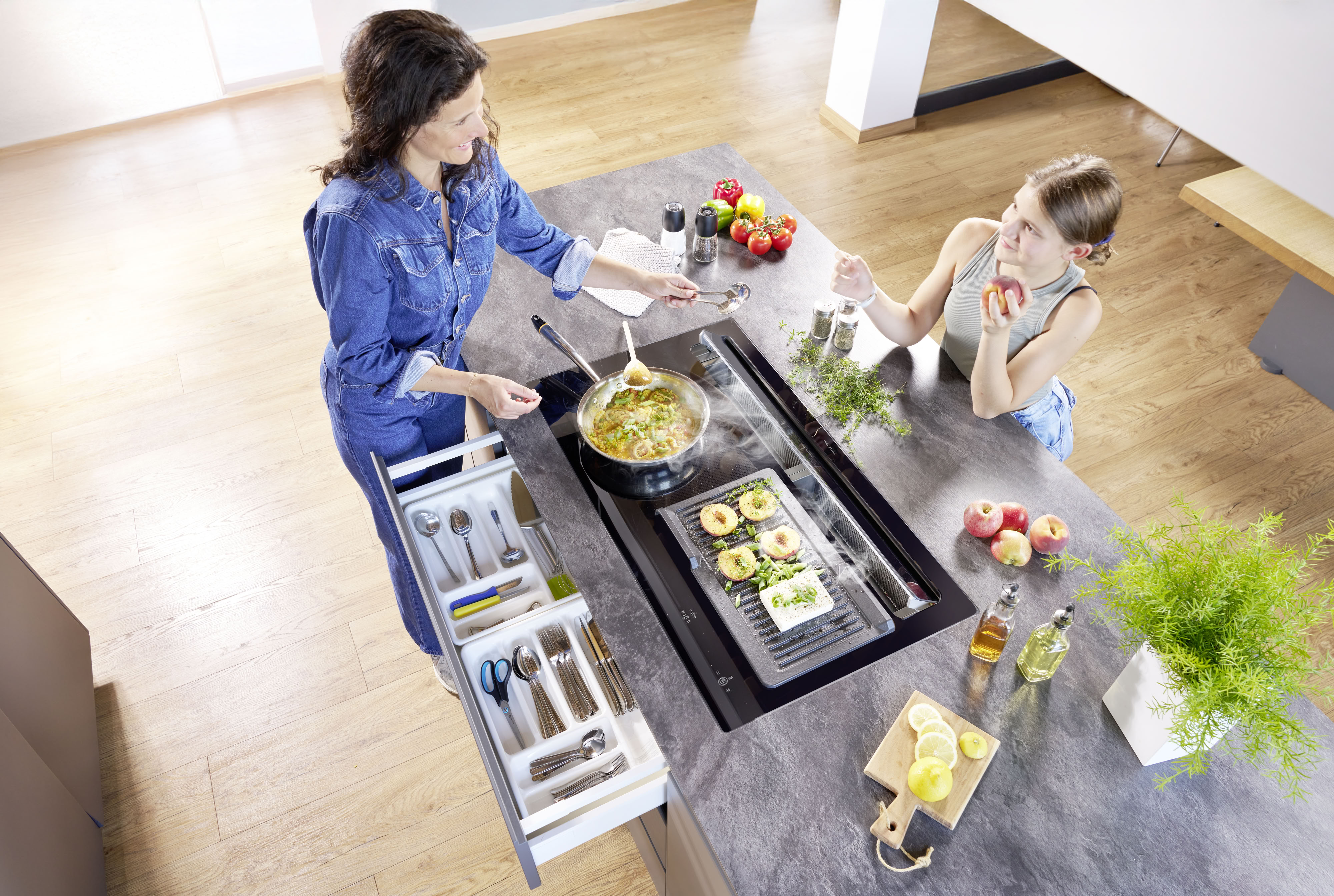 Das Besondere: Voller Stauraum im Schrank darunter. Die Besteckschublade und Schubladenauszüge sind auch direkt unter dem Kochfeld möglich, sogar bis zur vollen Tiefe. Durchdacht sogar bis zum Einbau: Dank unkomplizierter Technik ohne Werkzeug in 20 Minuten installiert.