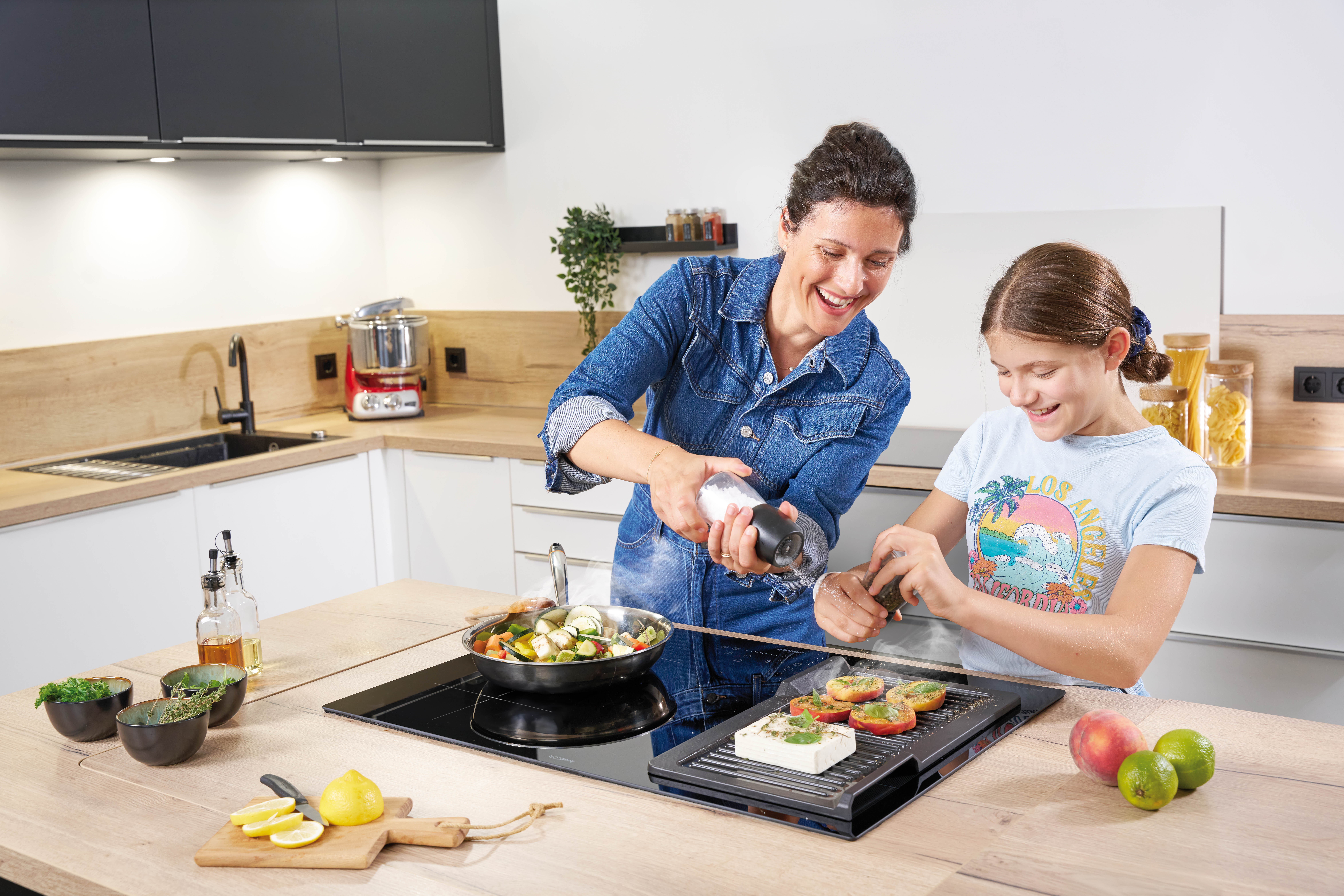 Der Abzug nach hinten besticht durch höchsteffizienten Fettabscheidegrad A. Da bleibt vom Kochdunst nur noch frische Luft. Der Abzug arbeitet ohrenschonend leise, sodass sogar in der Intensivstufe ein normales Gespräch geführt werden kann.